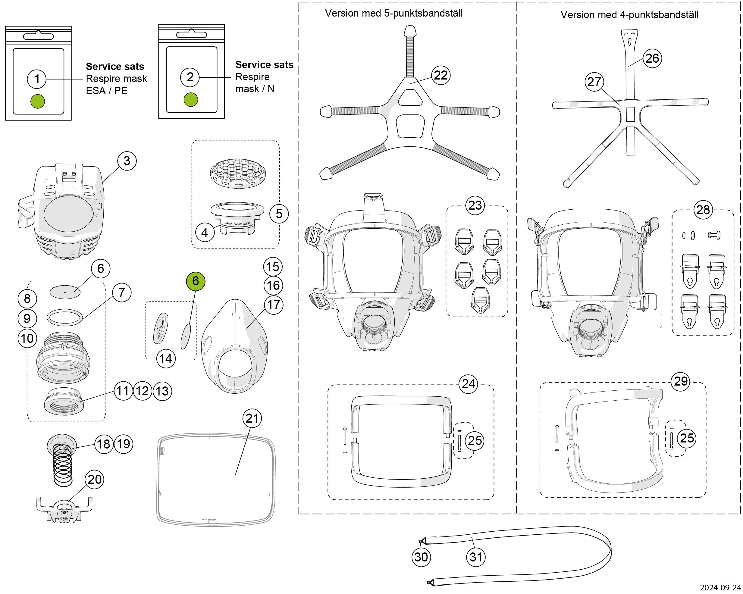 - Spolningsknapp på andningsventilen ökar luftflödet till masken