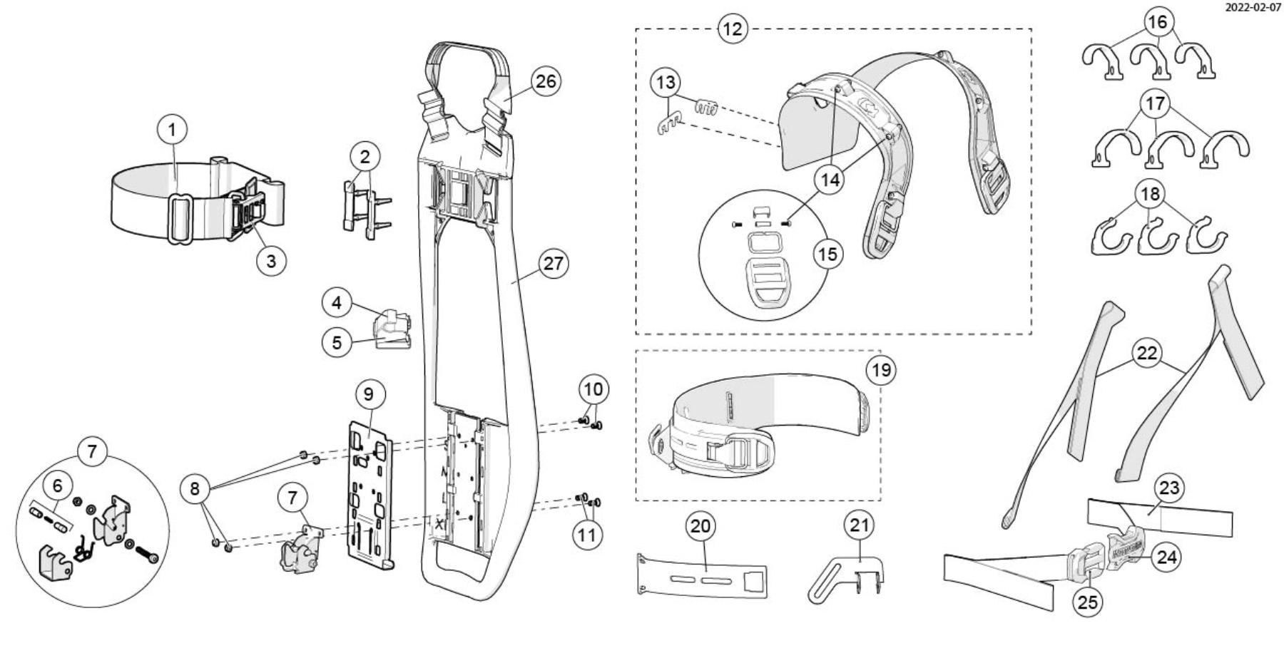 Bärstället kan enkelt anpassas till olika kroppsstorlekar med fyra olika storleksinställningar ("S", "M", "L", "XL"). Den valda storleken kan tydligt ses från både framsidan och baksidan. Tack vare den praktiska utformningen kan storleksjusteringen göras med flaskan monterad och utan att behöva ta loss apparaten från fästet i brandbilen.