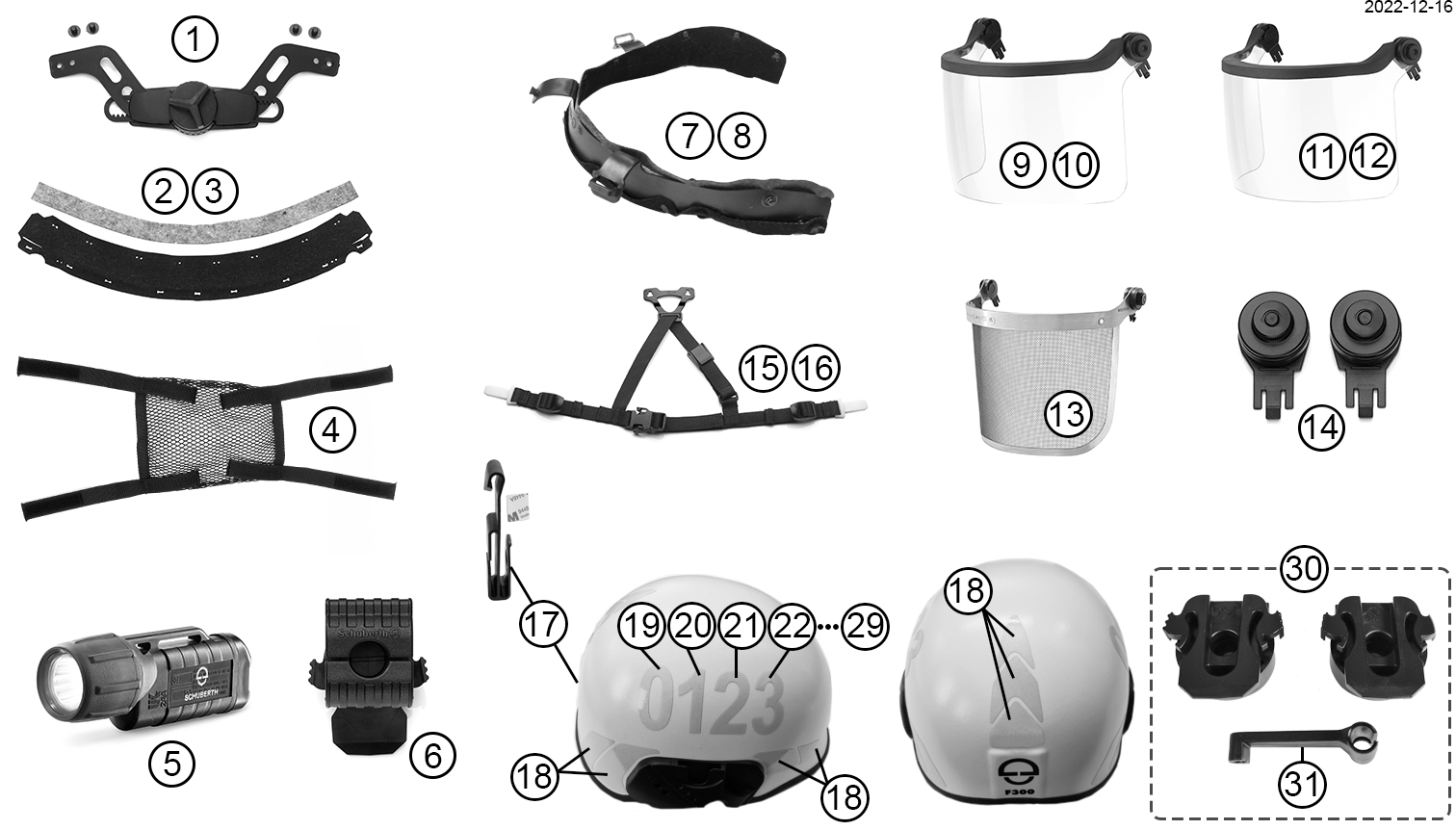 Tillbehör monteras på hjälmen med Multi-Funktions-Adaptern (MFA) som snabbt och enkelt kan addera en rad olika tillval, såsom: